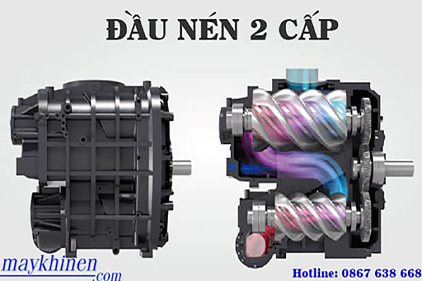 Máy nén khí 2 cấp là một dòng máy nén khí trục vít với 2 đầu nén độc lập, lưu lượng khí tăng thêm 15% so với máy nén khí đầu nén đơn cấp (1 đầu nén), với máy nén khí 2 cấp công suất lớn thì mức độ tiết kiệm điện năng càng cao.
