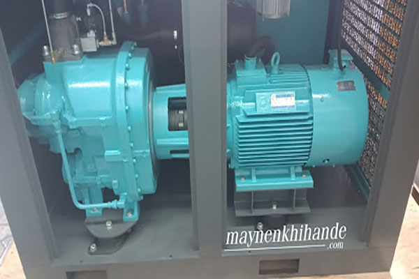 Cấu tạo máy nén khí 2 cấp cũng tương tự máy nén khí trục vít thông thường, chỉ khác là máy nén khí 2 cấp thì có 2 đầu nén (tham khảo hình ảnh đính kèm). Máy nén khí 2 cấp HANDE thường có công suất lớn, sử dụng đầu nén Hanbell AB (có 6 vòng bi), quạt hút ly tâm và sử dụng biến tần Inovance.